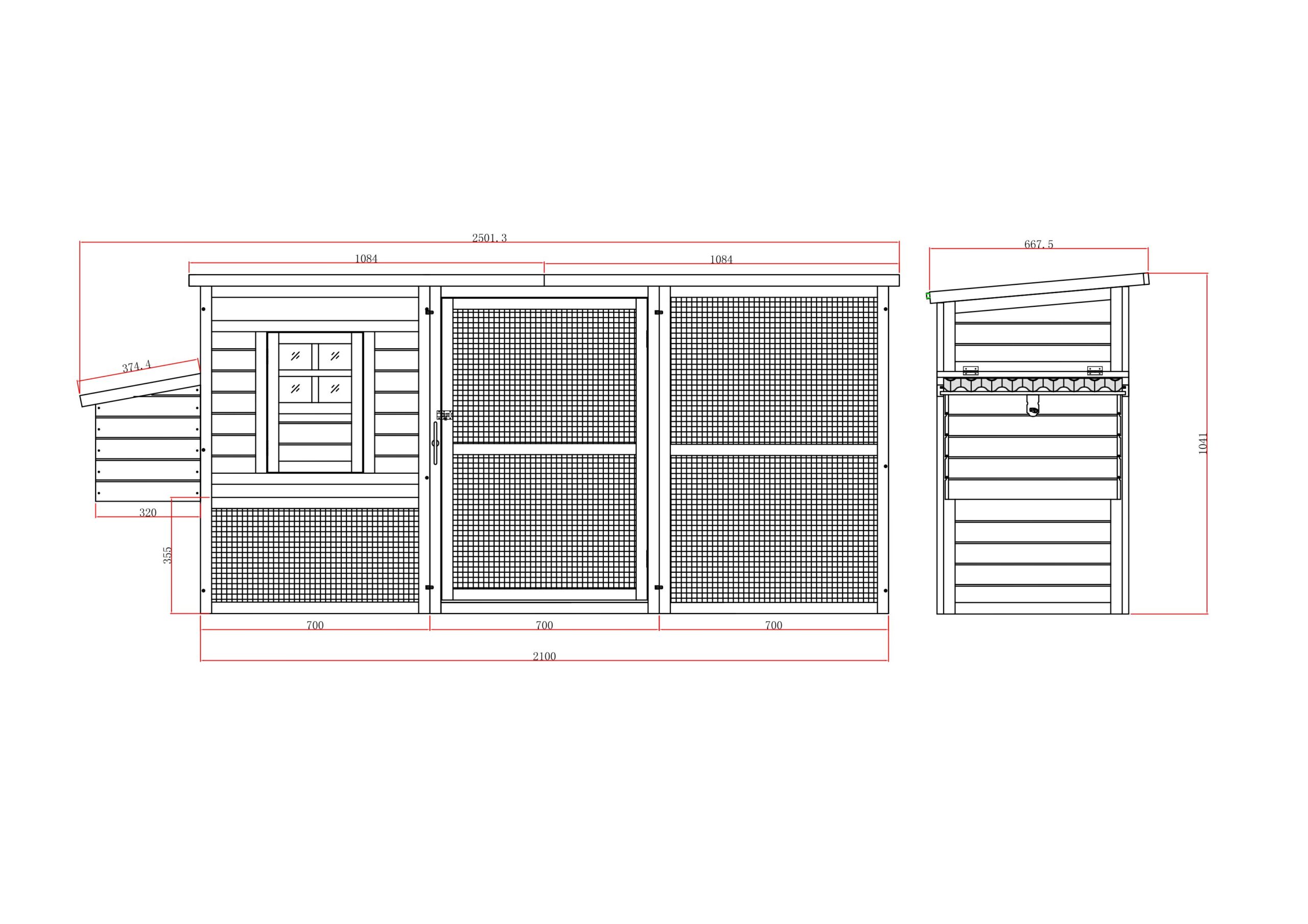 Overall size (including nest box and roof overhangs): 250cm (L) x 66cm (W) x 104cm (H)